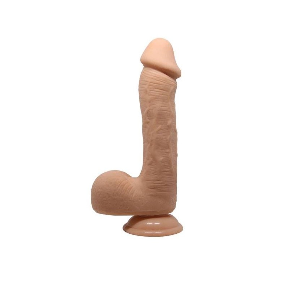 Pênis realístico 22,2cm com glande saliente, veias, escroto e ventosa.