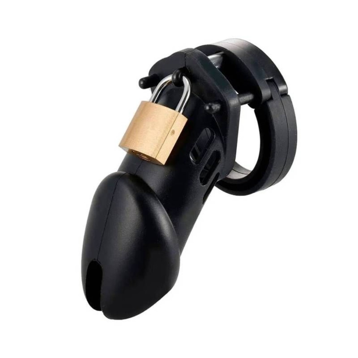 Acompanha um cadeado metálico com chaves para prender o anel no cinto, permitindo encaixar o escroto.