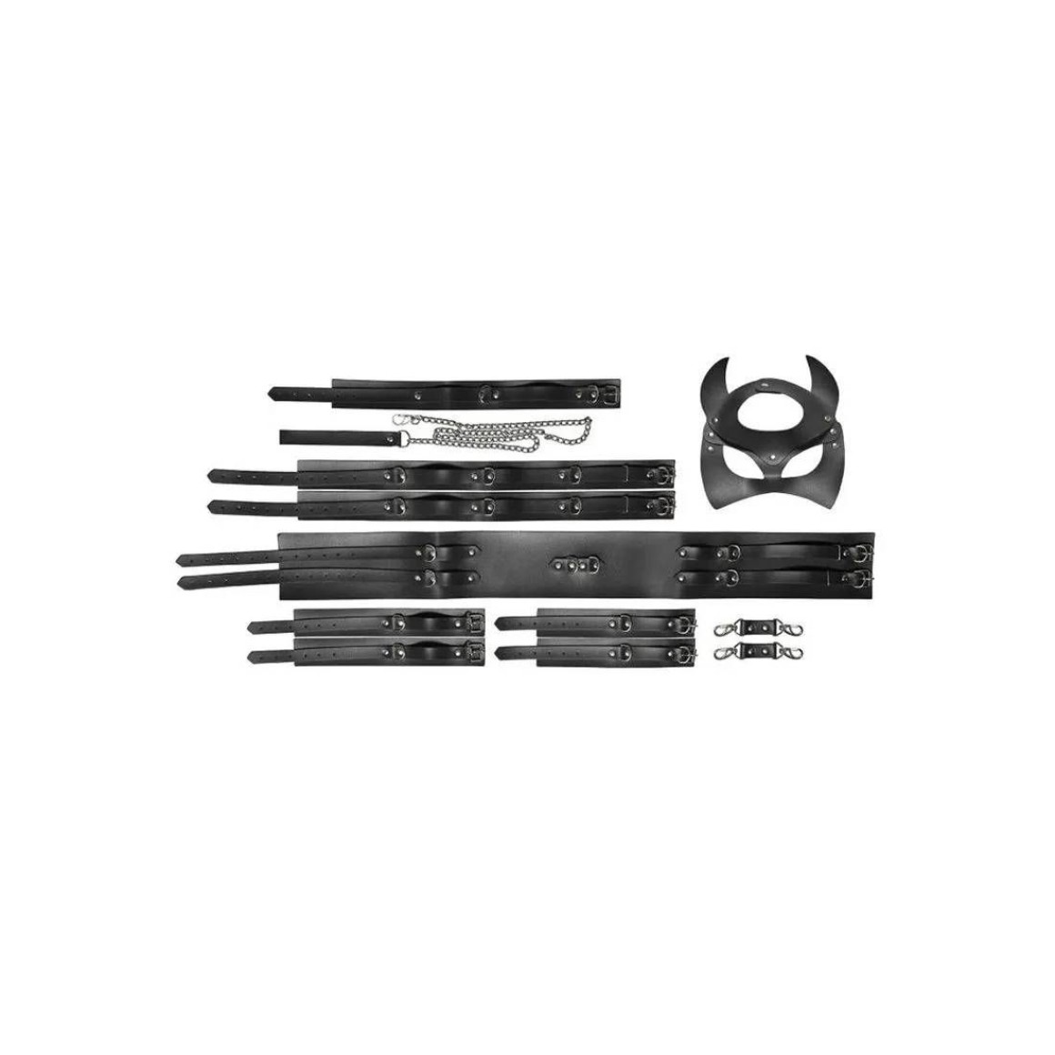 Indicação: produto vendido como acessório Itens inclusos: máscara, algemas, tornozeleiras, coleira, harness corset e restritor de coxas.