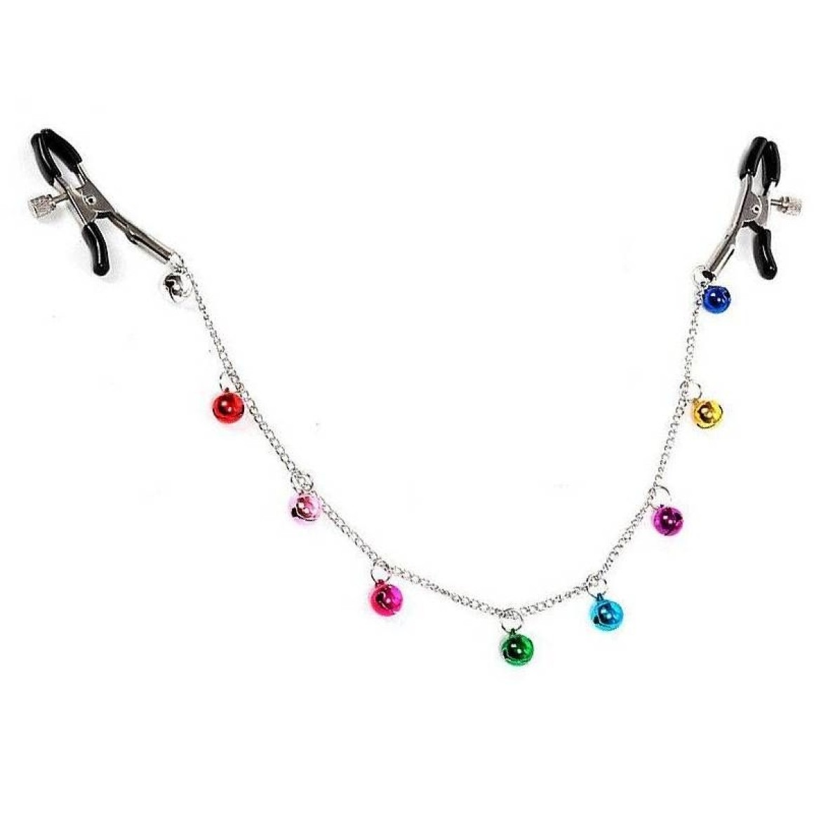 O prendedor de mamilos possui ajustes e guizo de metal.