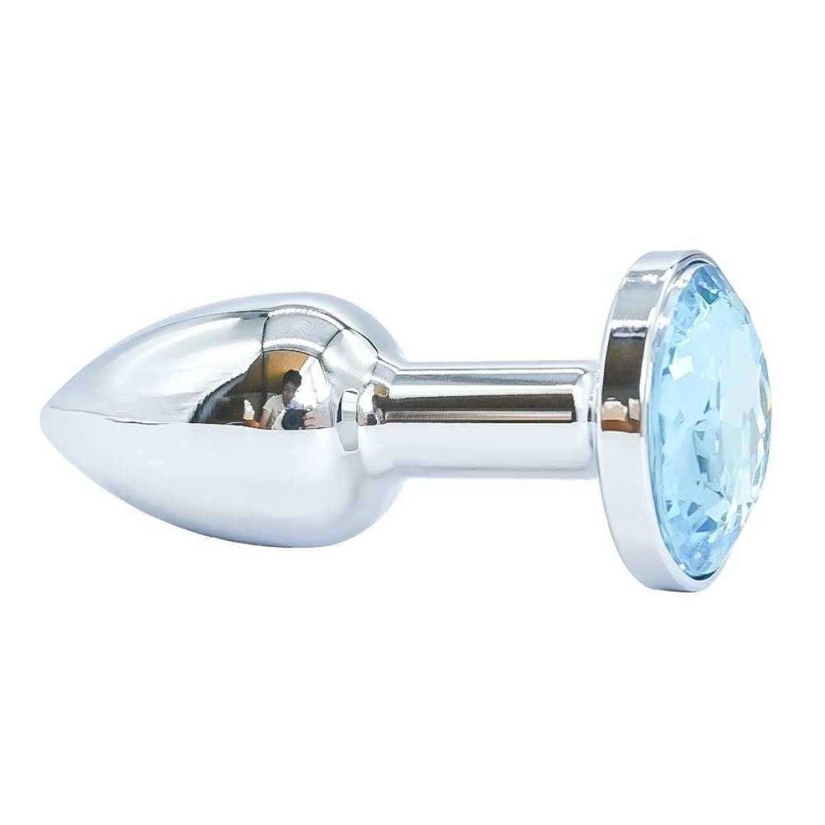 Plug anal de luxo em metal, com formato cônico, feito em alumínio fundido e polido a mão, possui em sua base uma pedra lapidada que lembra um diamante colorido.