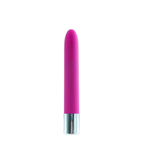 Vibrador personal 17 cm. Possui superfície suave a aveludada e um motor com 12 modos de vibração controlado a partir de um botão em sua base. Pode ser usado com capas penianas e como vibrador anal.
