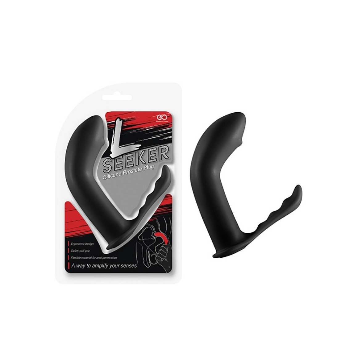Plug anal de silicone para estimulação da próstata em forma de L. Sua base foi desenvolvida para facilitar o manuseio podendo assim oferecer mais prazer para quem está usando.