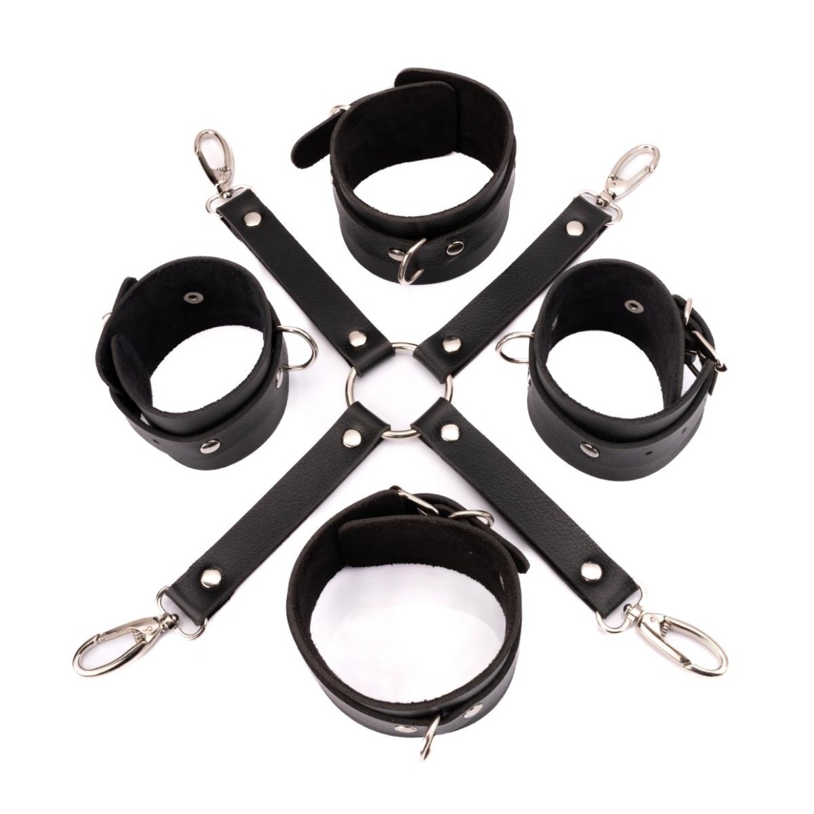 Este separador é composto por duas algemas bracelete e duas tornozeleiras interligadas por uma peça em formato de X. Pode ser usado em diversas posições.