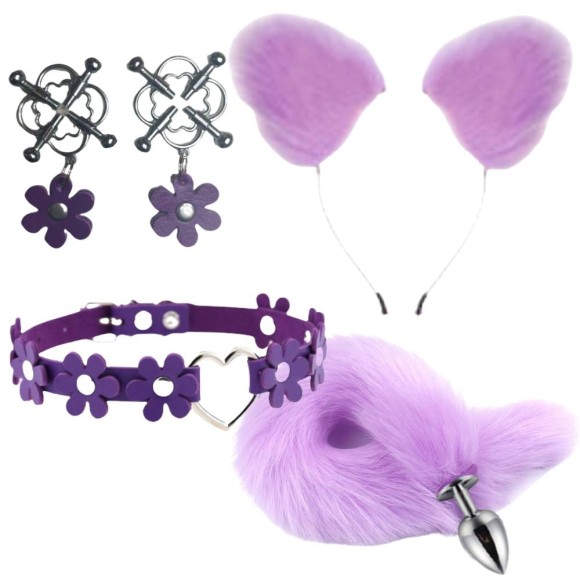 Kit fox composto por 1 tiara de pelúcia + 1 plug anal com cauda de pelúcia + 1 par de grampos para seios rosqueável parafuro com detalhe de flor na ponta + coleira vazada em formato de coração com detalhes em flores.