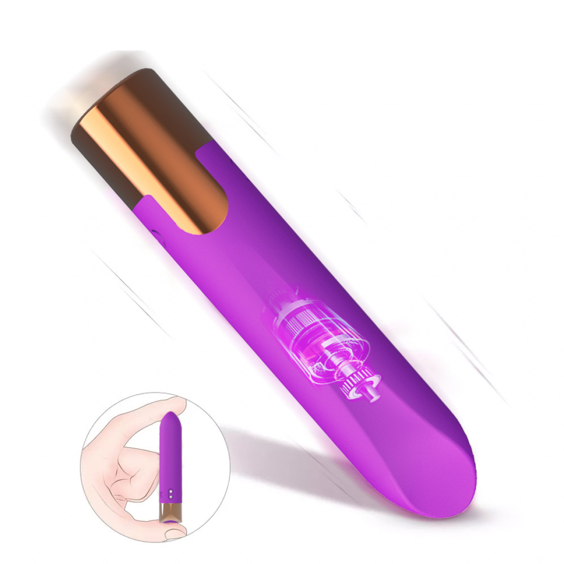 Cápsula vibratória em silicone formato anatômica com ponta estimuladora e possui 1 botão para ligar e troca de desempenho e detalhes metalizados