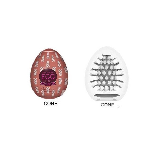 Dentro da embalagem em forma de casca, você encontra uma peça de silicone que imita um ovo, porém oca e com um orifício na base.