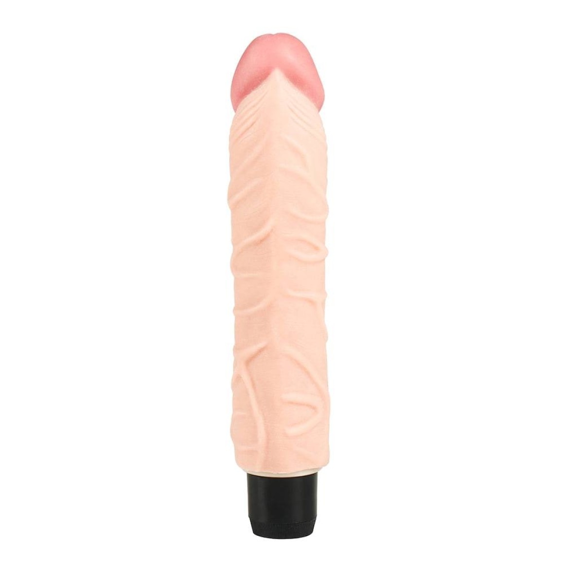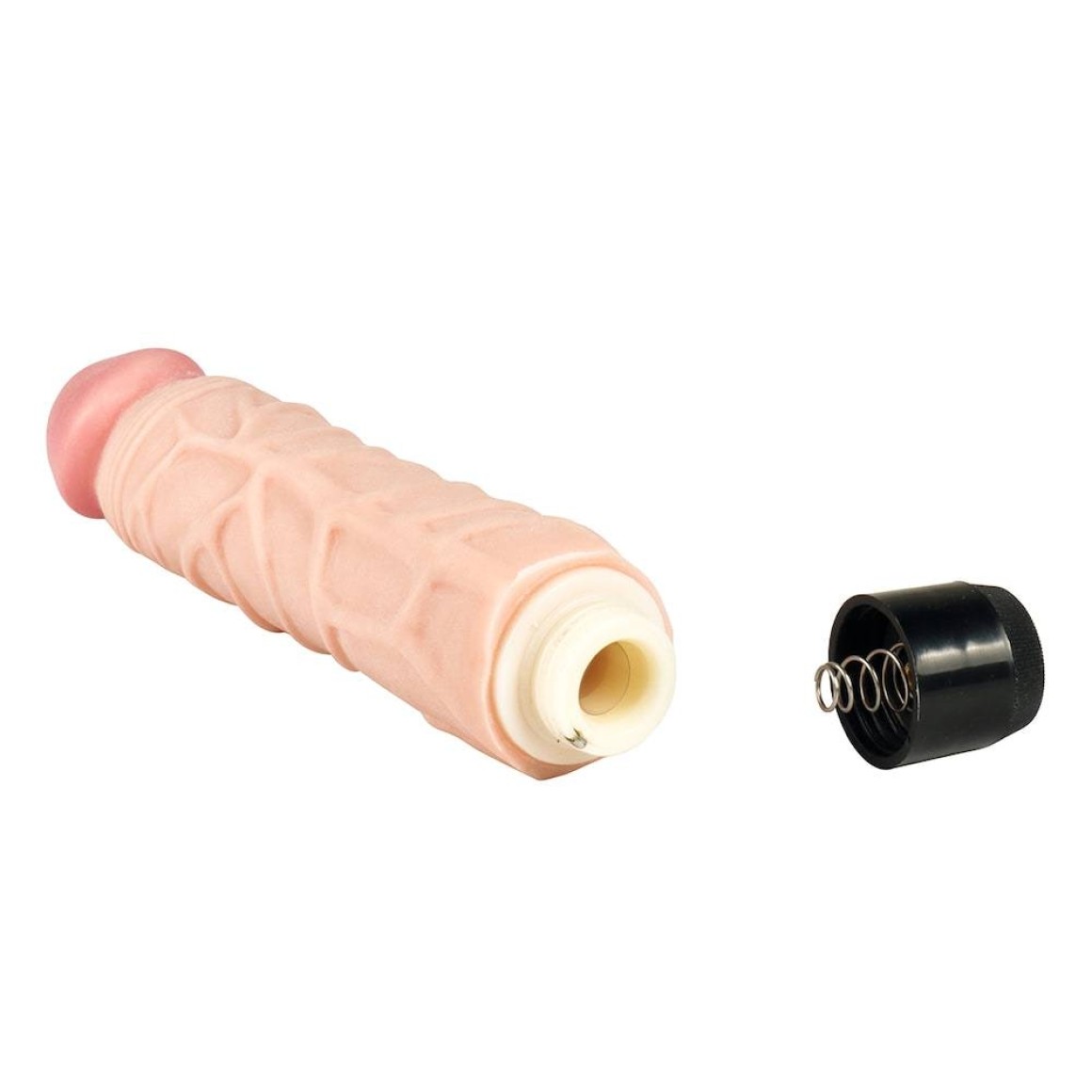Prótese realística, em formato de pênis com glande definida e textura de veias salientes ao longo do corpo, confeccionado em TPE, material macio que se assemelha a pele humana.