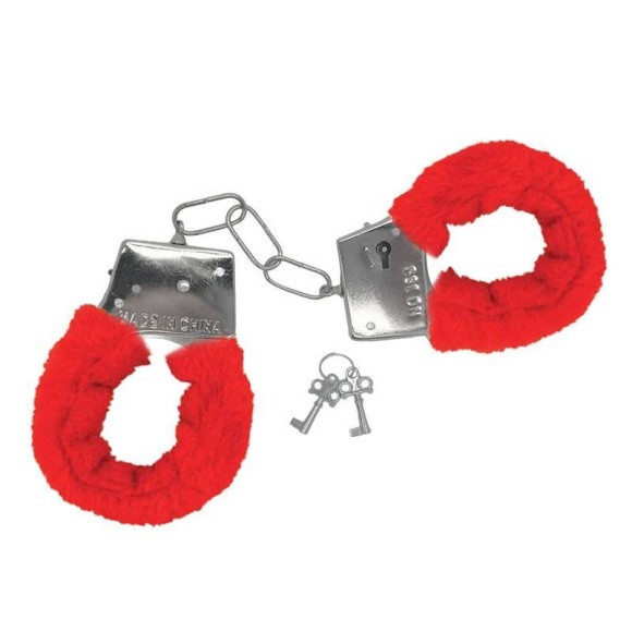 Algemas em metal cobertas com capa de pelúcia. Possui chave e trava de segurança.