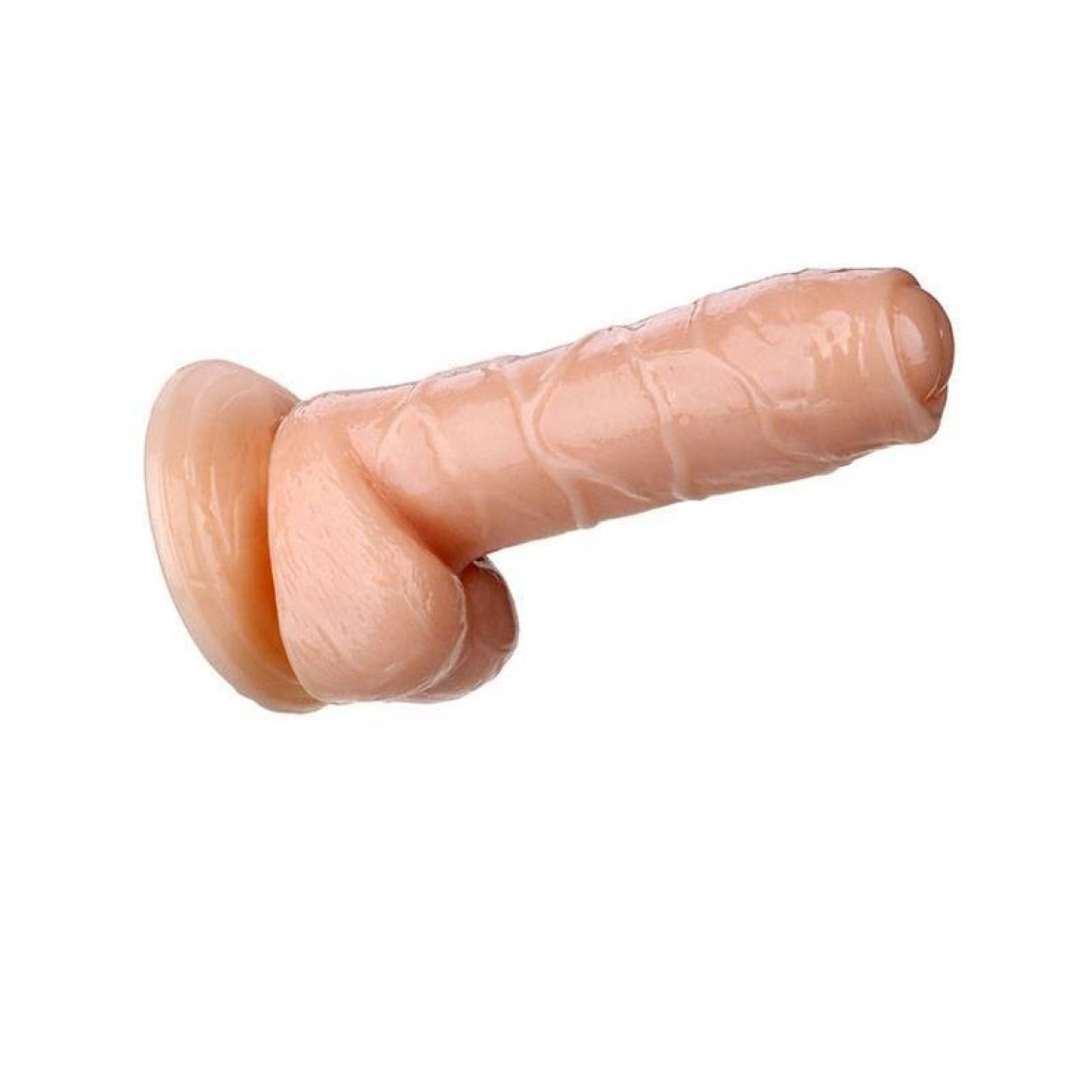 Prótese realística 17,5 cm com veias salientes, glande encoberta pelo prepúcio, escroto e ventosa.