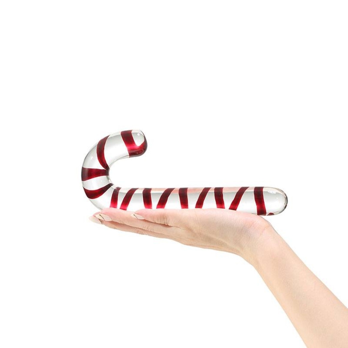 Plug anal em vidro formato bengala natalina com detalhe espiral vermelho.