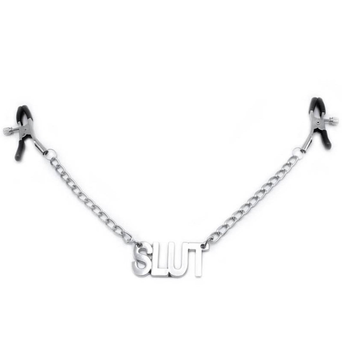 Par de Grampos para Mamilos com Regulagem e Pingente Escrito SLUT