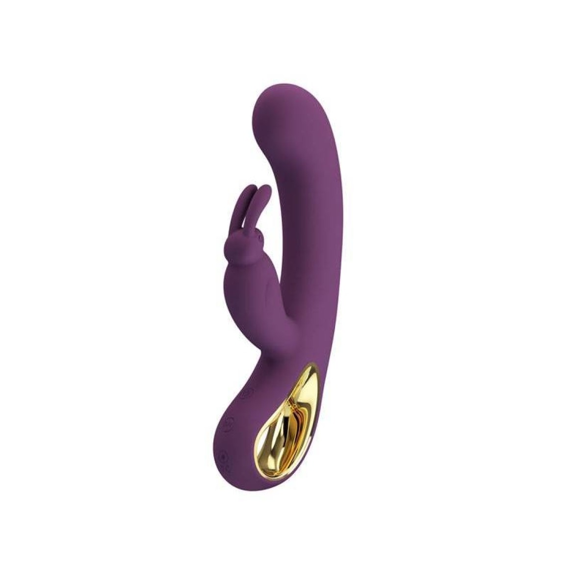 Vibrador recarregável com alça metalizada, levemente curvado na ponta para estimulação do ponto G e estimulador clitoriano vibratório em formato de coelho.
