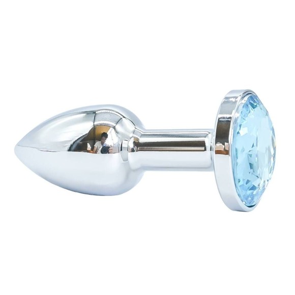 Plug anal de luxo em metal, com formato cônico, feito em alumínio fundido e polido a mão, possui em sua base uma pedra lapidada que lembra um diamante colorido.