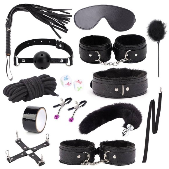Inclui um chicote de franjas para estimulação, fita adesiva para imobilização, prendedores de mamilos com sinos para novas sensações, dados eróticos para brincadeiras divertidas, uma pena de estimulação para toques suaves, cruzetas de imobilização para restrição segura, um plug anal com cauda de raposa para um toque de fantasia, cordas para amarração versátil, uma venda para privacidade e intensidade, uma mordaça com bola,uma coleira para dominação, algemas de mão e tornozelo para imobilização confortável, e uma coleira com guia para conexão e controle.