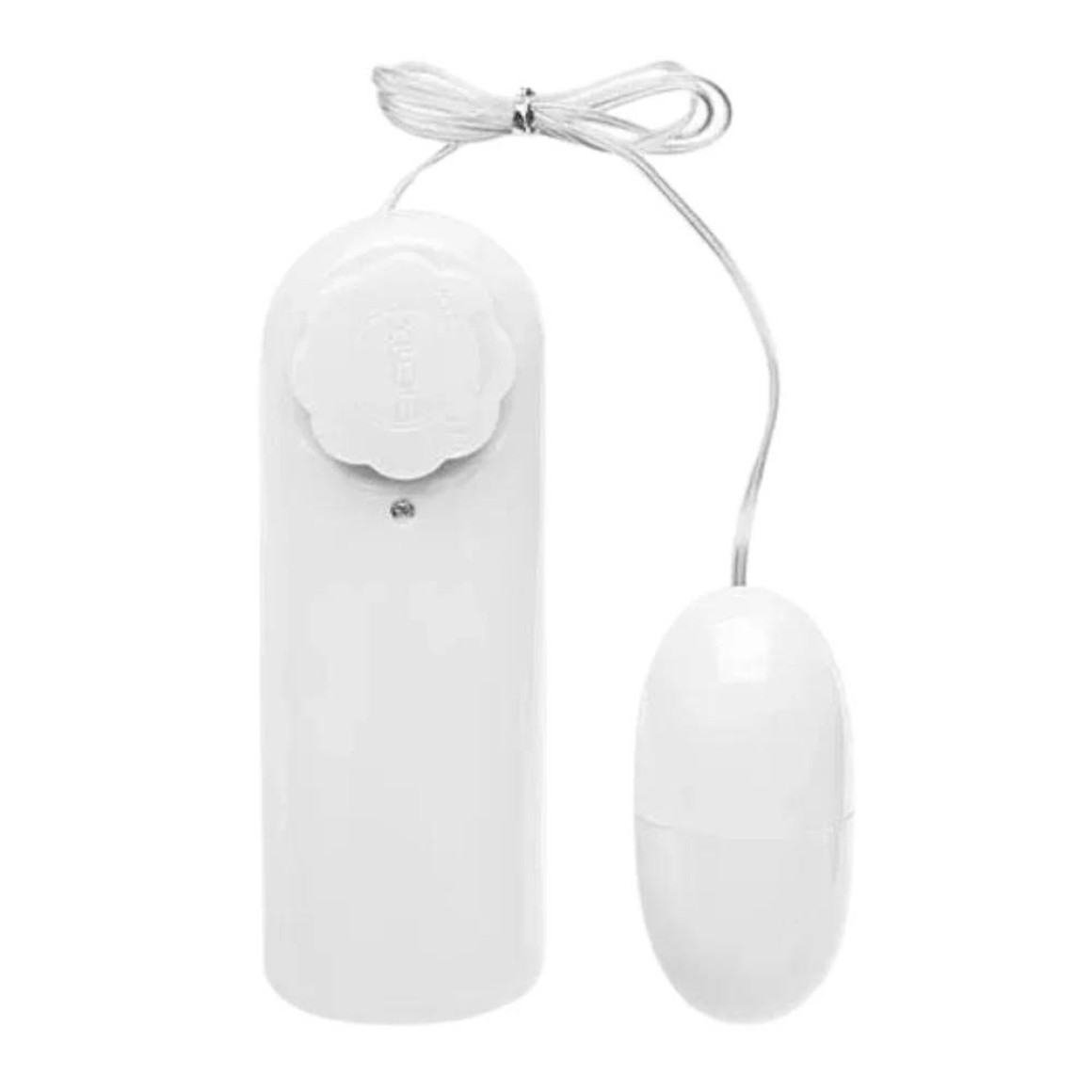 Cápsula vibratória bullet em formato bala com controle remoto com fio, tendo um único botão giratório para o controle da vibração.