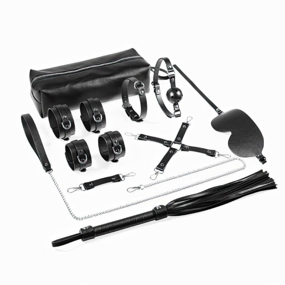 Este kit é composto por oito itens essenciais para explorar o mundo do bondage, todos armazenados em uma bolsa de transporte prática e discreta. Inclui uma venda, uma coleira com guia ajustável, algemas de mão e tornozelo para imobilização segura, um chicote, fivela de uma linha, fivela cruzada, e uma mordaça com bola.