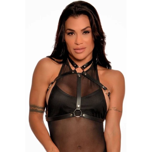 As argolas estrategicamente colocadas não apenas adicionam um toque de sofisticação, mas também destacam elegantemente o busto, conferindo-lhe uma aparência deslumbrante e irresistível. O design ousado deste harness não passa despercebido, garantindo que você se destaque em qualquer situação.