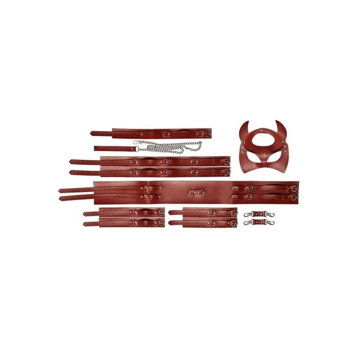 Indicação: produto vendido como acessório Itens inclusos: máscara, algemas, tornozeleiras, coleira, harness corset e restritor de coxas.