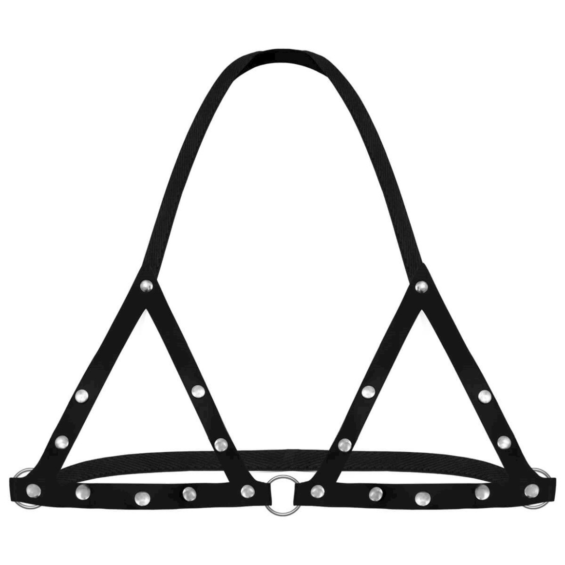 Esse modelo de top é muito sensual, seu formato em triângulo torna a peça muito mais provocante, deixando em destaque os seios. Possui rebites em todo o seu contorno.