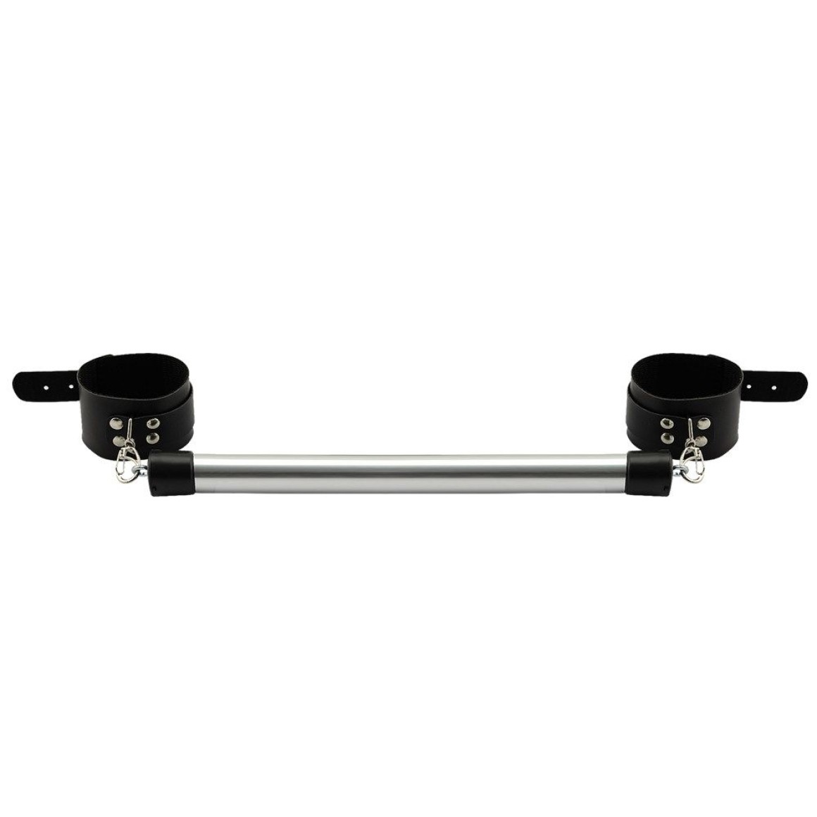 Separador de pernas com base em alumínio de 50cm com algemas em couro sintético em sistema de fivelas.