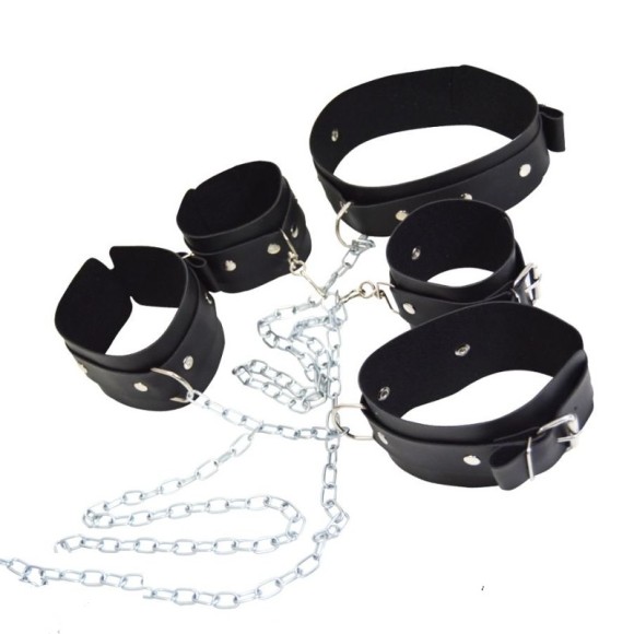 Kit contém um par de algemas, uma coleira e um par de tornozeleiras com corrente.