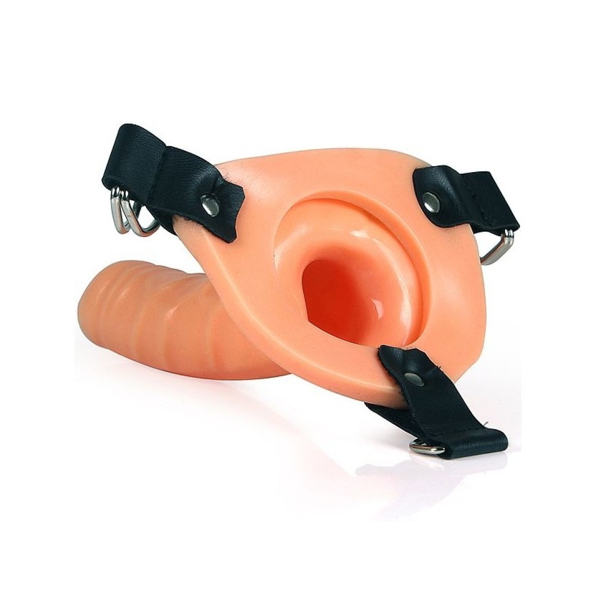 Capa para penetração vaginal ou anal com a brase triangular, em PVC atóxico de fácil higienização em formato de pênis com 15 cm de comprimento e 3,5 cm de diâmetro, com cinta com regulagem, em couro sintético.