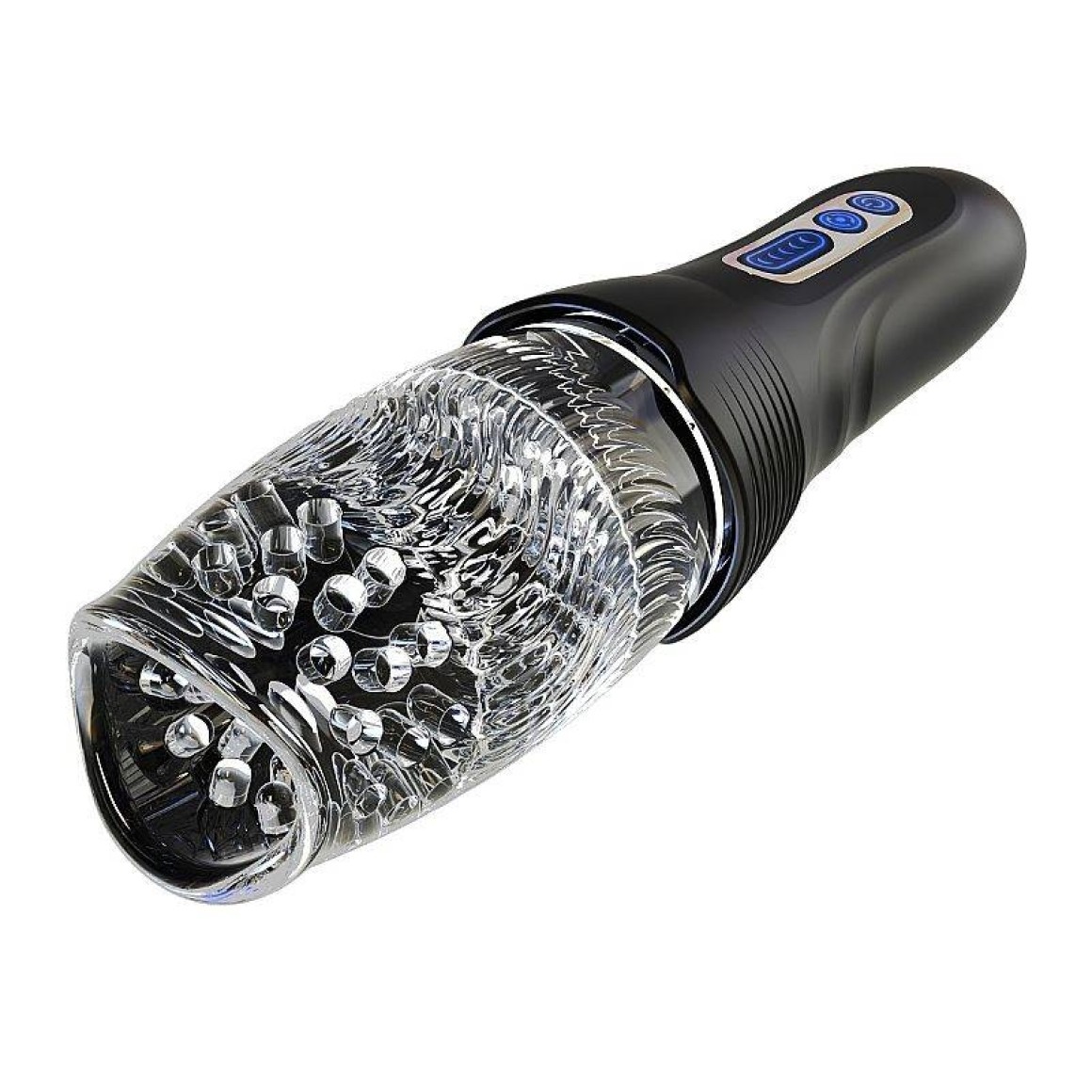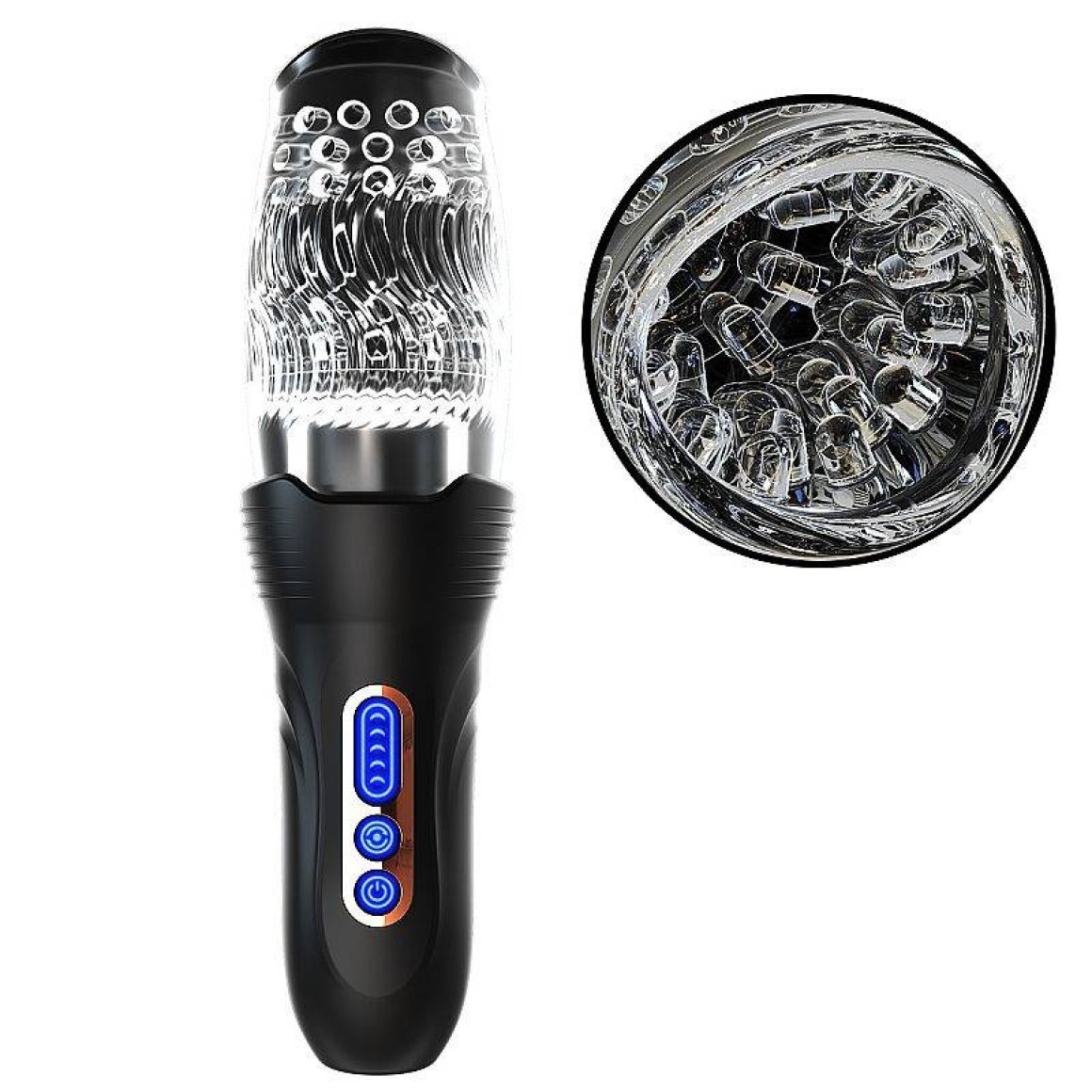 Masturbador masculino com formato de lanterna - possui 5 modos de vai e vem. 10 modos de vibração e 5 modos de rotação.