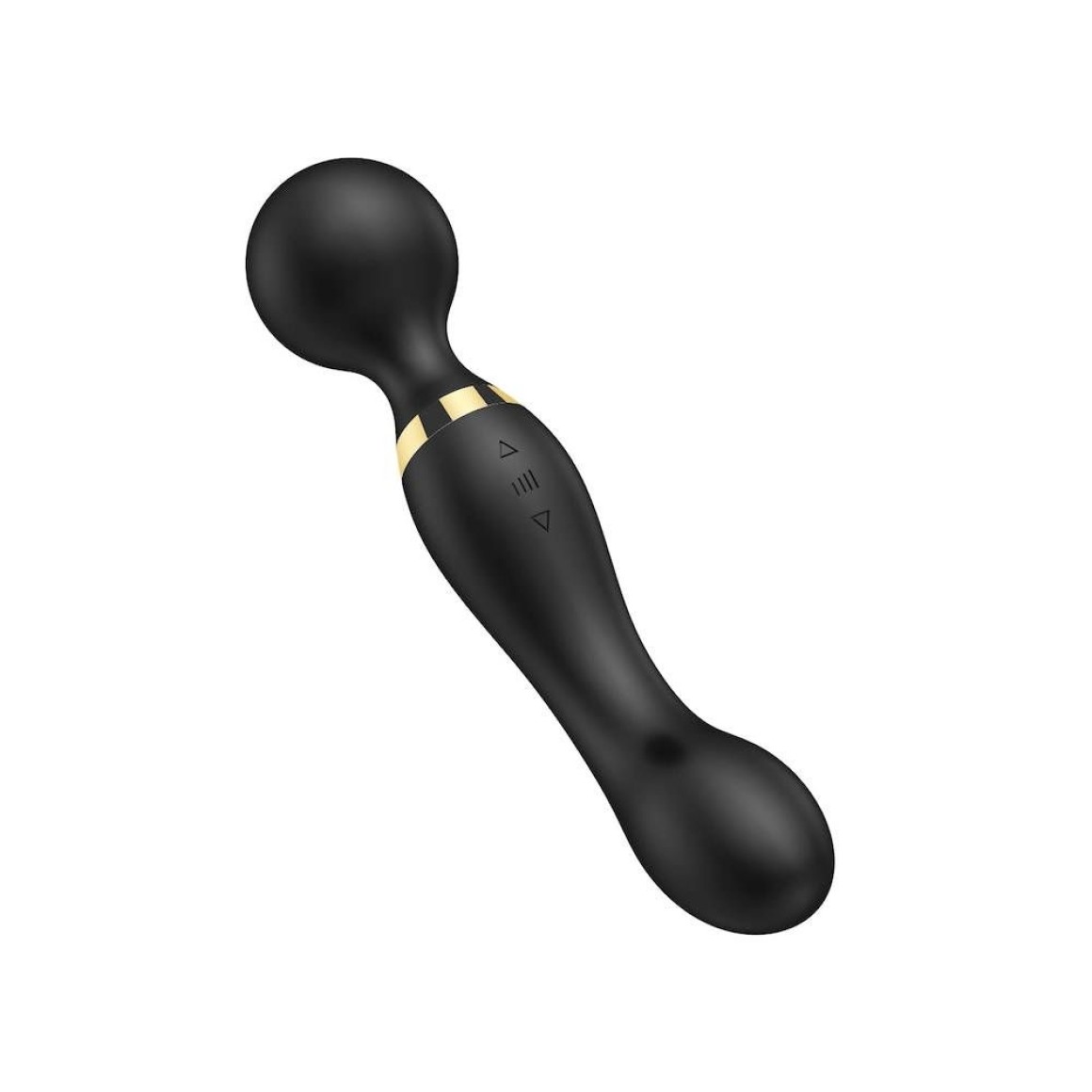 Vibrador com dupla estimulação, sendo em uma ponta um vibrador ponto G e na outra ponta um potente massageador corporal, controle de fácil acesso.