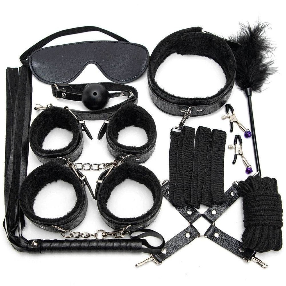 Explore o universo do bondage e sadomasoquismo com este kit completo e versátil. Contém 7 itens essenciais: mordaça, venda, coleira com guia, algemas, tornozeleiras, prendedores de mamilos e chicote. Confeccionado em materiais resistentes e confortáveis como poliéster, pelúcia e PVC, o conjunto oferece segurança, estilo e estímulo sensorial para experiências intensas.