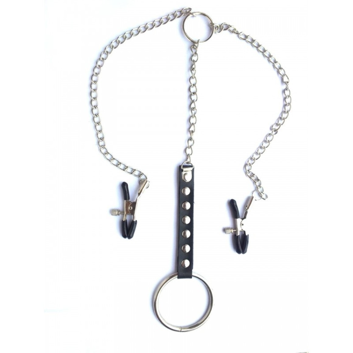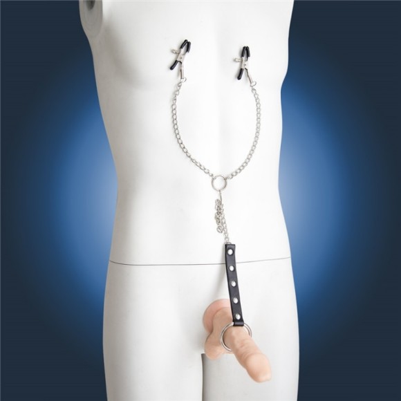 PRENDEDOR PARA MAMILOS MASCULINO COM CORRENTE E ANEL PENIANO EM METAL