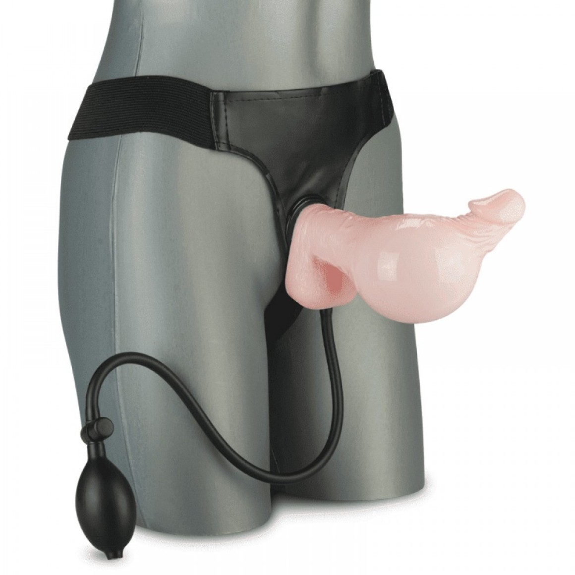 Cinta peniana de elastano com fivelas para regular o ajuste. Acompanha um pênis inflável com glande saliente e relevos estimulantes em formato de veias. Possui uma bomba de pressão manual e um botão para liberação do ar.