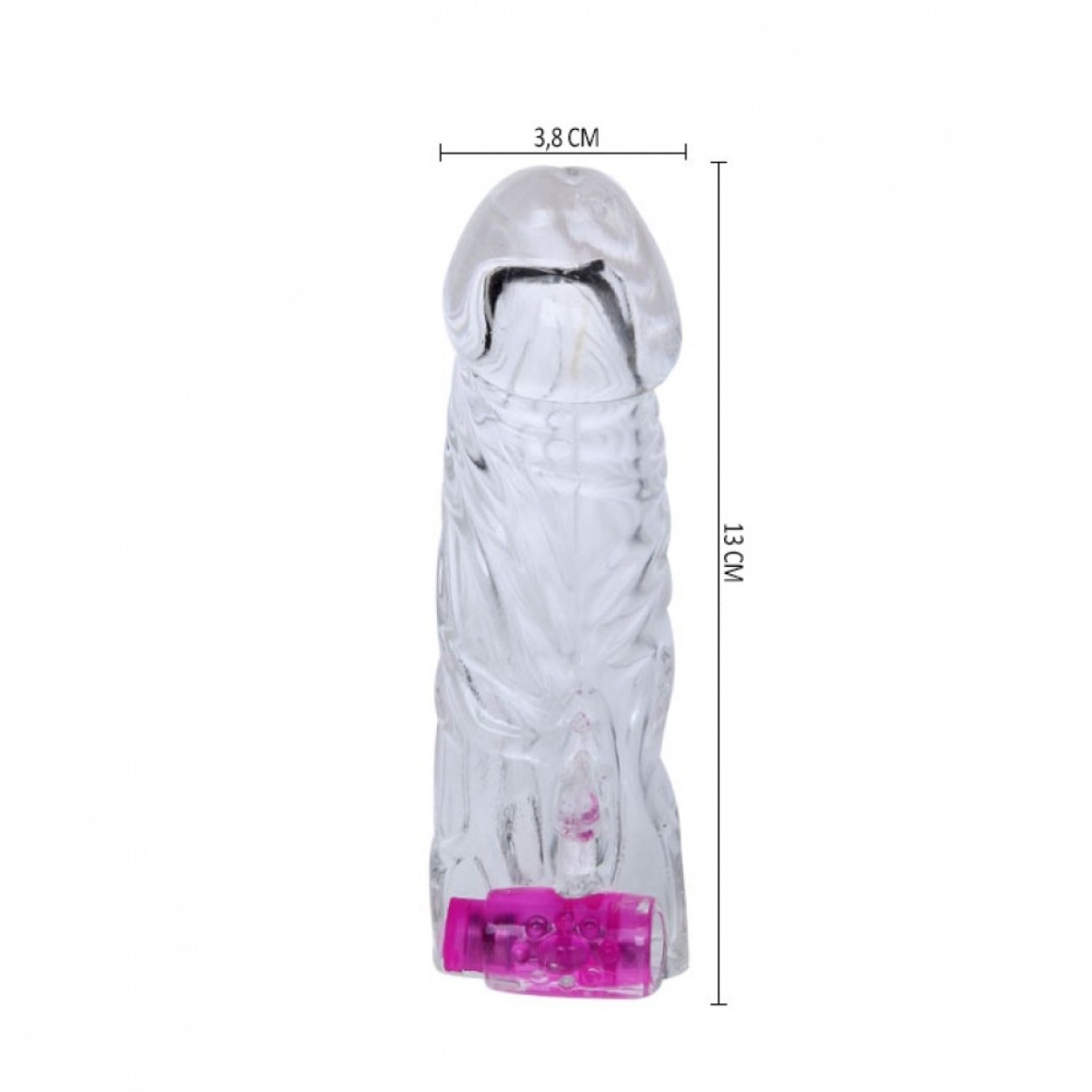 Capa peniana com estimulador de clitóris com cápsula vibratória. Feita em material macio, possuindo relevos salientes para maior excitação.
