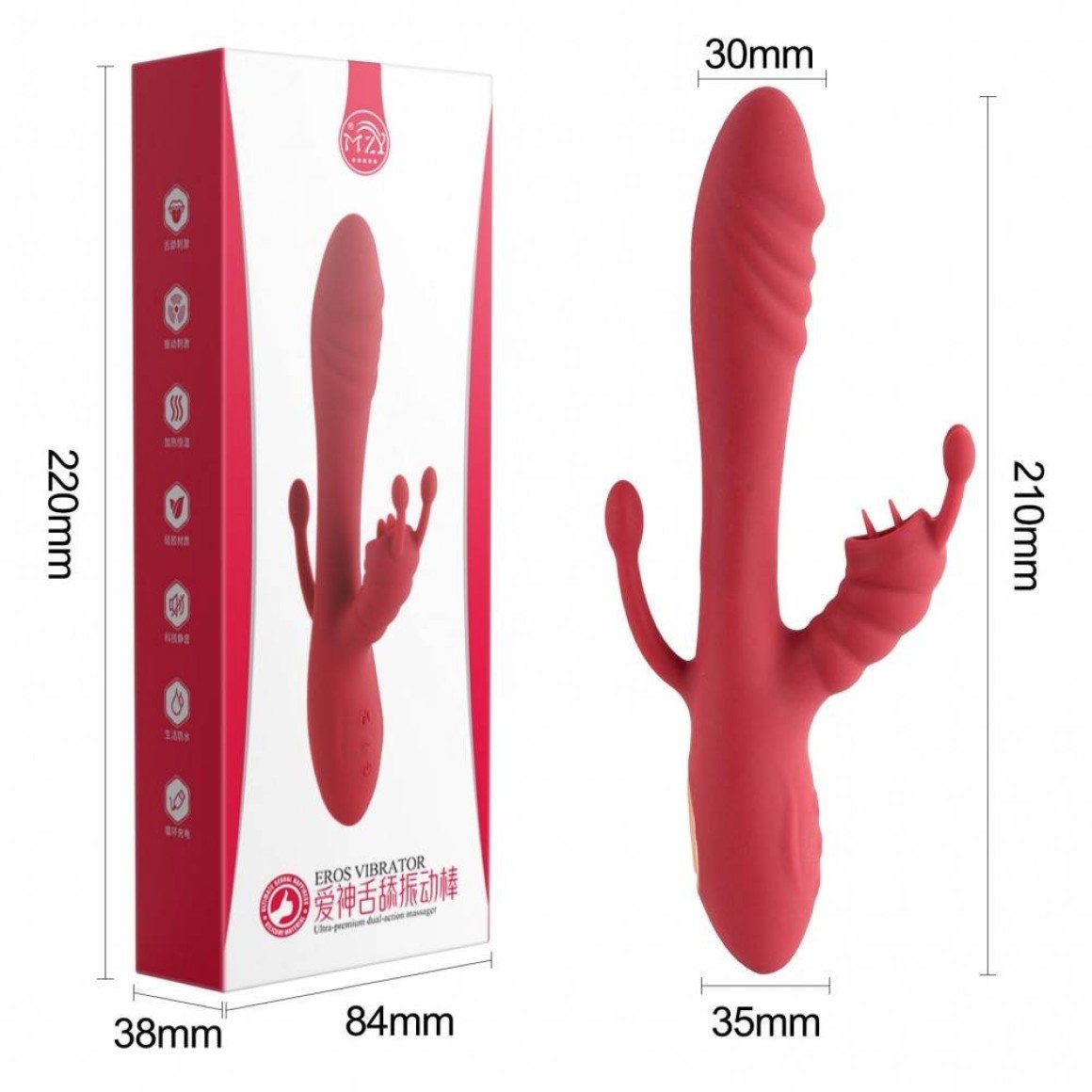 Vibrador de ponto G, com estimulador de clítoris. 12 modos de vibração e função de aquecimento. Dupla penetração, proporcionando maior prazer. Estimulador de clítoris no formato de língua, com função de vai e vem. Ponta texturizada. Recarregável, acompanha cabo USB. Medidas: 21x3.2cm. Peso: 122g. Medidas de penetração:14cm. Material: Silicone + ABS.