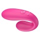 7 modos de vibrações intensas controladas por controle remoto com design moderno na cor magenta com detalhes nos botões na cor preta.