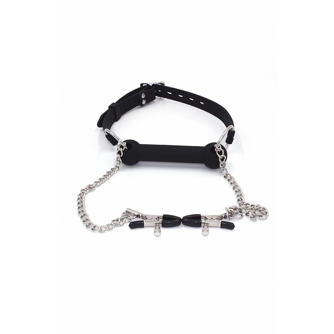 Silencie seu amante com esta luxuosa mordaça com grampos de mamilos. Se encaixa confortavelmente dentro da boca, enquanto a pulseira de couro macio é facilmente ajustada para caber todos os tamanhos.