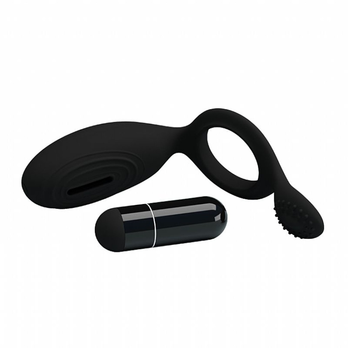 Anel peniano duplo com vibrador, possui um anel para o pênis e outro para escroto, também possui um vibrador para estimulação do clitóris, com nódulos para garantir uma maior sensação de prazer para a sua parceira.