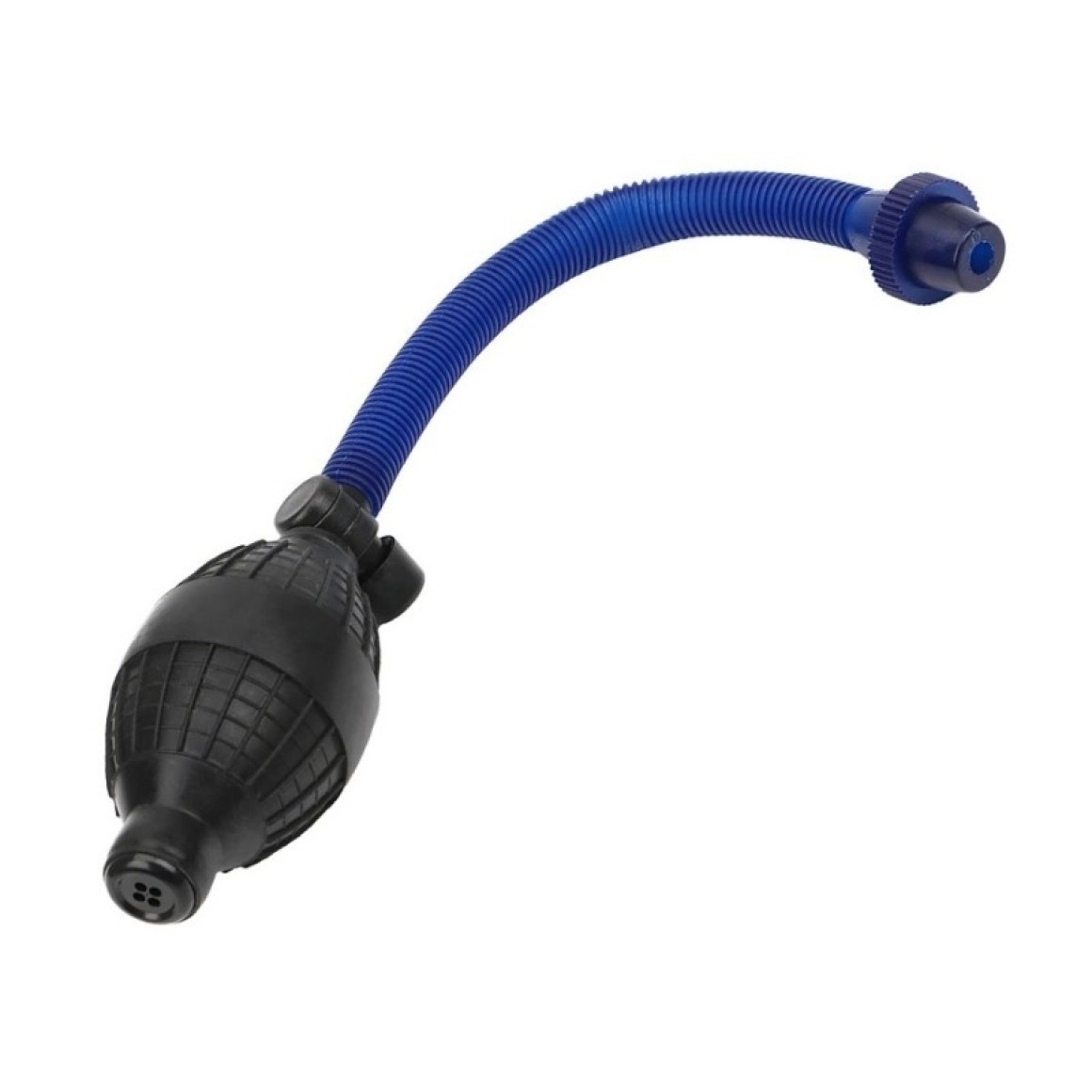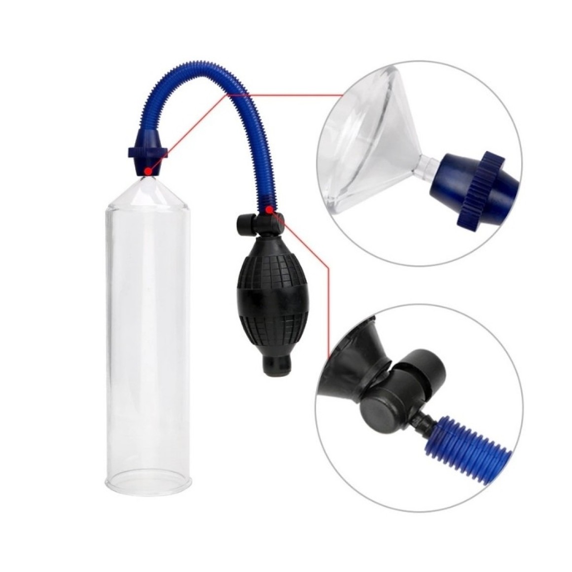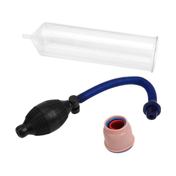Bomba peniana com tubo de acrílico com sucção manual e pera de bombeamento e válvula para controle da pressão, acompanha 3 anéis da base em silicone.