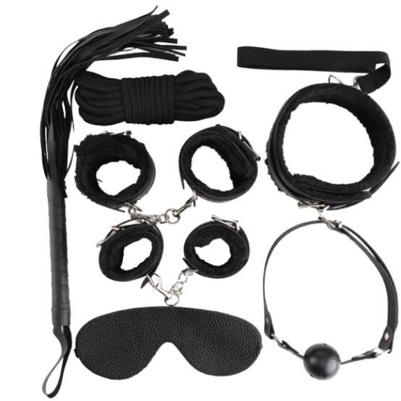 Kit bondage com 8 peças, sendo: Algema, Tornozeleira, Venda, Corda, Coleira e guia revestidas em couro sintético por fora e pelúcia por dentro.