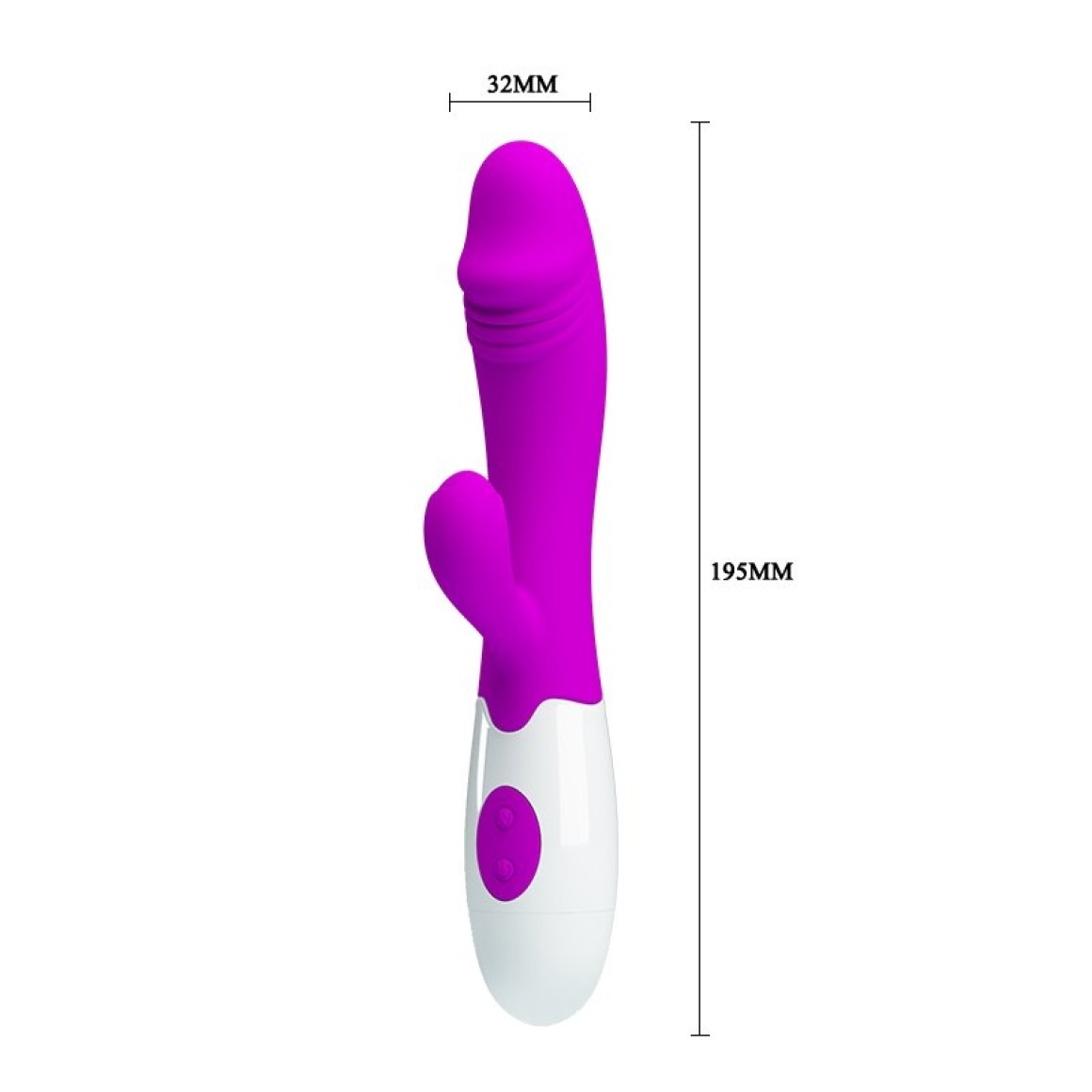 Vibrador com detalhe de glande em sua ponta, estimulador clitoriano em formato de botão de flor. Possui 30 modos de vibração.