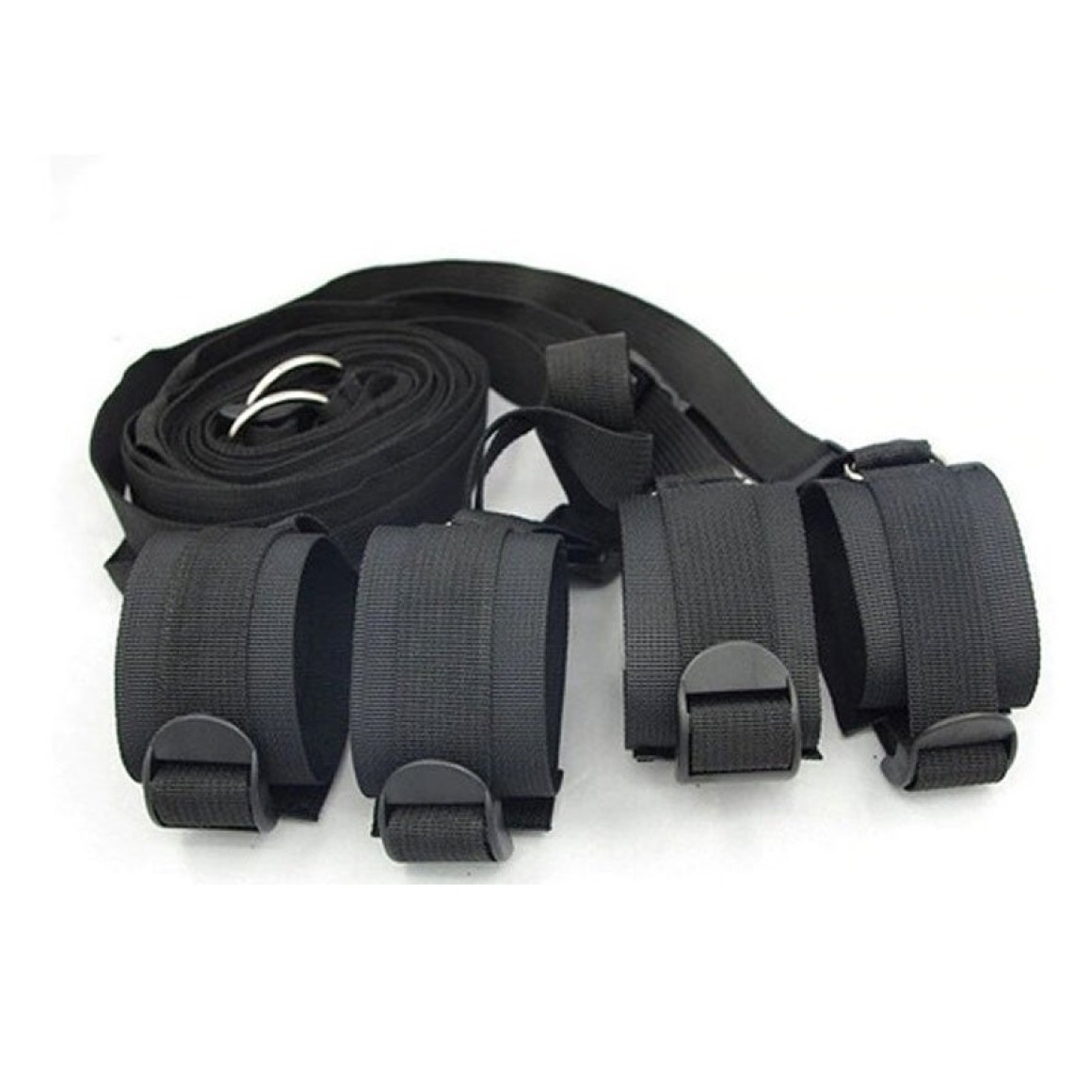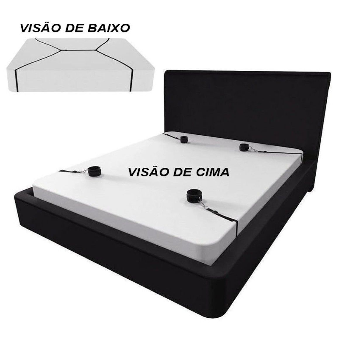 Kit para prender na cama com par de algemas e par de tonozeleiras com fechamento através de velcro. Possui duas tiras reguláveis que passam embaixo do colchão e interligadas.
