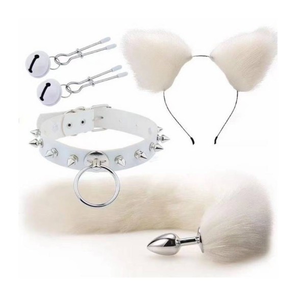 Kit fox composto por 1 tiara de pelúcia, 1 plug anal com cauda, 1 prendedor de mamilo com sino e 1 coleira com spikes.
