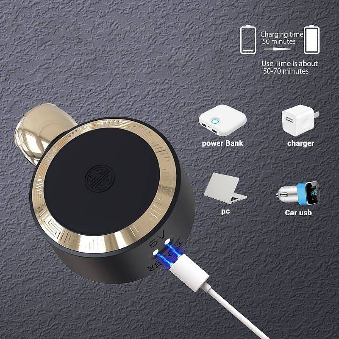 Para ligar/desligar aperte o botão e segure por 3 segundos, aperte 2 vezes para iniciar a vibração.