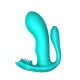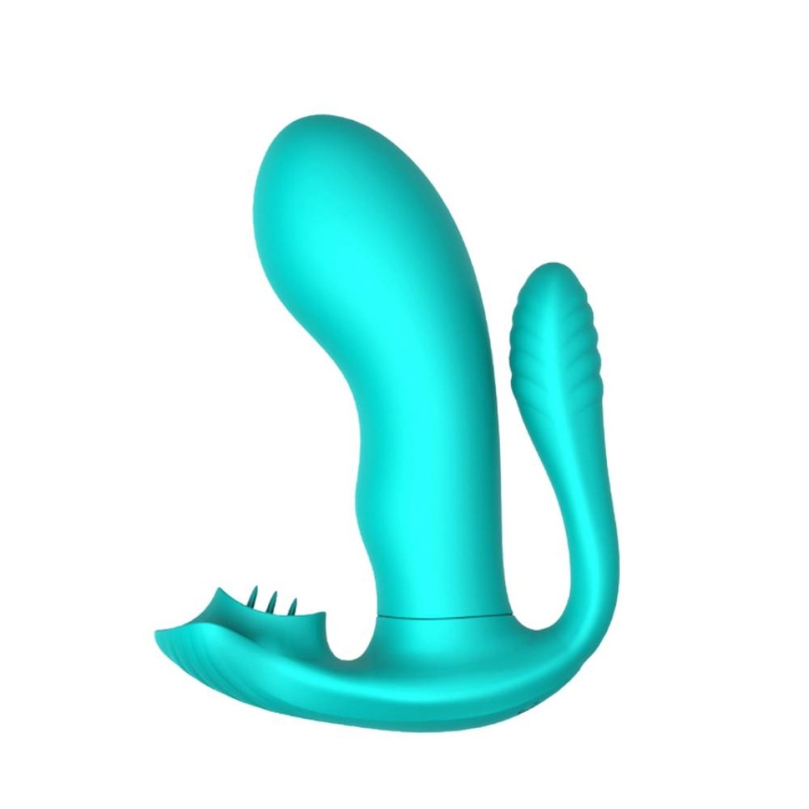 Vibrador calcinha em formato escalonado com estimulação tripla sendo: Estimulador do ponto G arredondado, estimulador anal com cerda estimuladora e estimulador clitoriano com cerdas massageadora. Possui aquecimento no ponto G e controle remoto