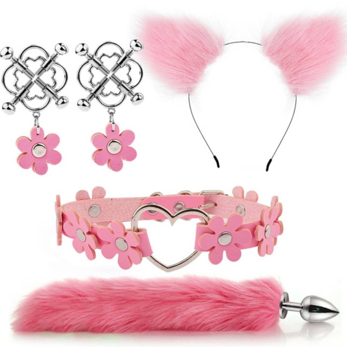 Kit fox composto por 1 tiara de pelúcia + 1 plug anal com cauda de pelúcia + 1 par de grampos para seios rosqueável parafuro com detalhe de flor na ponta + coleira vazada em formato de coração com detalhes em flores.