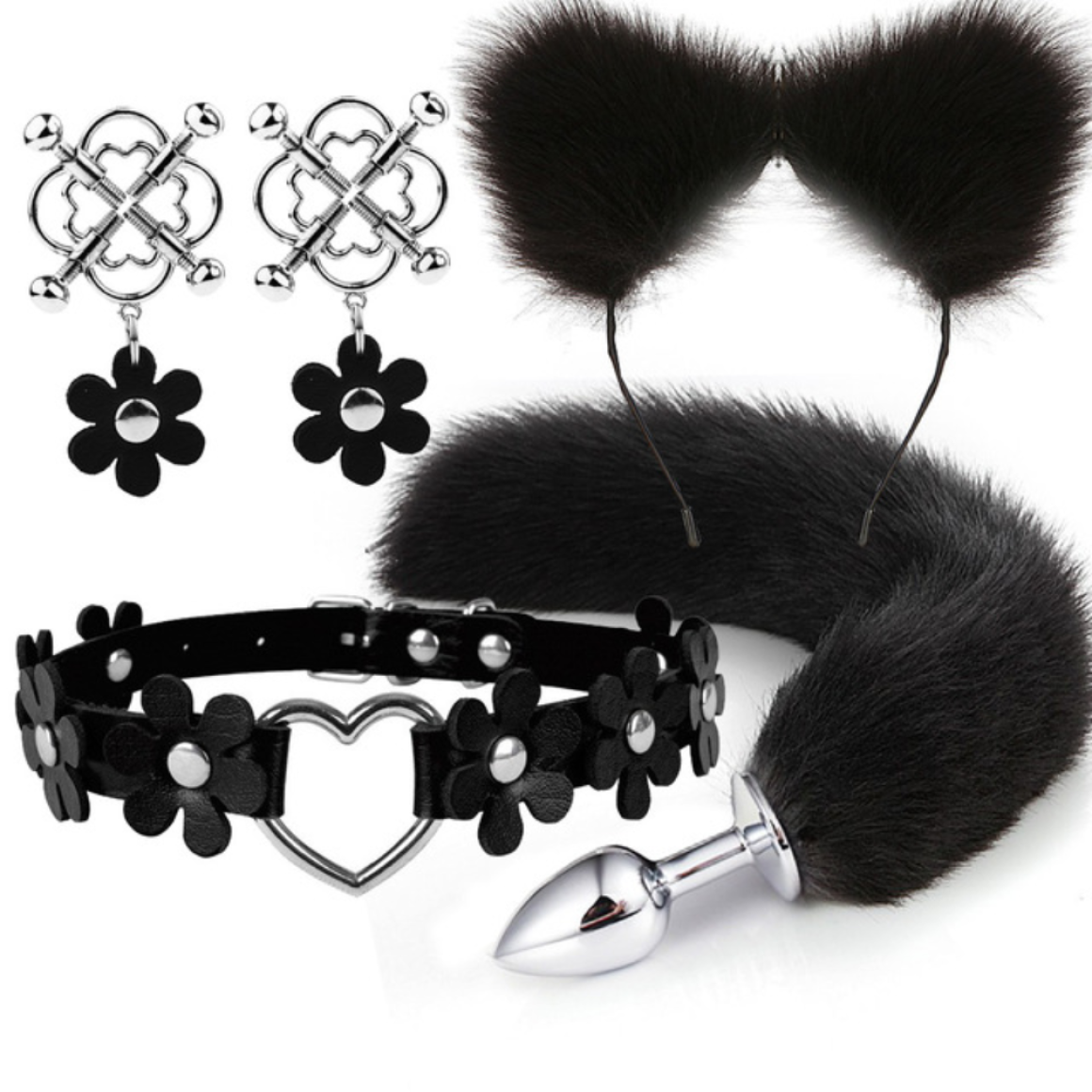 Kit fox composto por 1 tiara de pelúcia + 1 plug anal com cauda de pelúcia + 1 par de grampos para seios rosqueável parafuro com detalhe de flor na ponta + coleira vazada em formato de coração com detalhes em flores.
