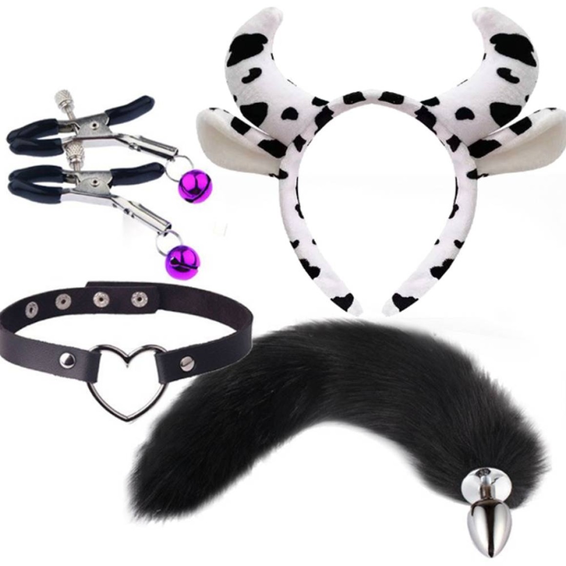 Kit fox composto por 1 tiara de pelúcia em design de vaquinha + 1 plug anal com cauda de pelúcia + 1 par de grampos para seios em metal com presilhas ajustáveis com guizo na ponta + coleira com coração vazado.