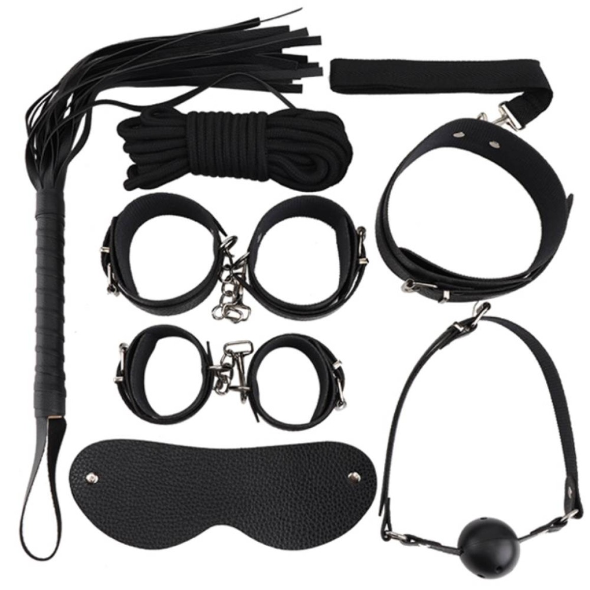 Kit bondage com 8 peças, sendo: Algema, Tornozeleira, Venda, Corda, Coleira e guia revestidas em couro sintético.