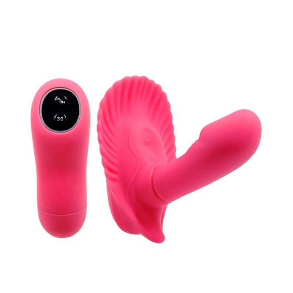 Estimulador de clitóris em formato de concha com pênis. Possui 30 modos de vibração e controle remoto wireless.