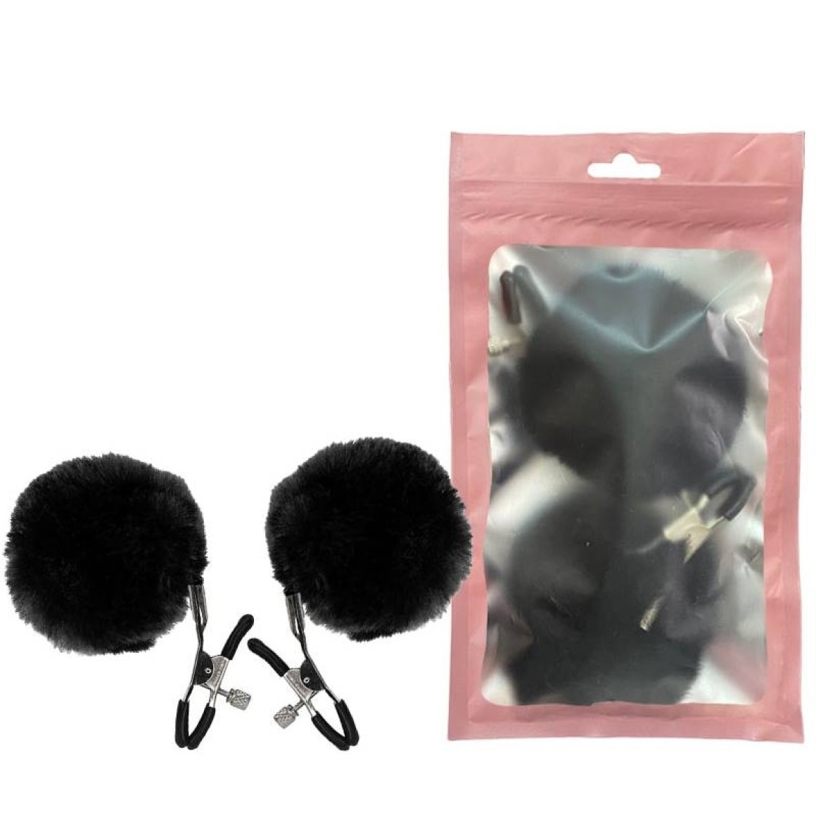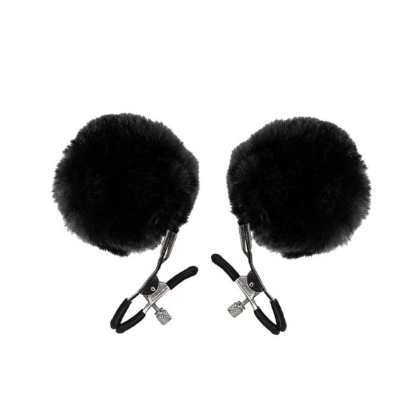 Grampos para mamilos com presilhas ajustáveis e pompom. Material: Metal e pelucia